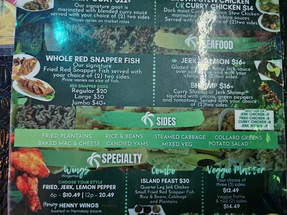 Jerk Chicken + Fried Red Snapper comes with plantains, cabbage and rice and beans.